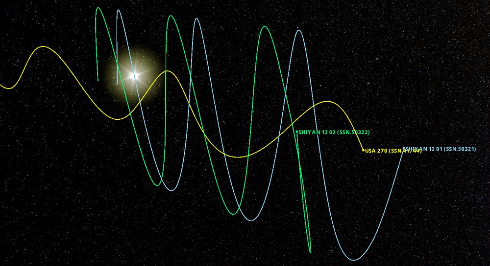 As USA 270 closed in on Shiyan-12-01 and Shiyan-12-02, the Chinese inspection satellites took off in opposite directions with Shiyan 12 02 moving into position to get a sunlit view of the U.S. surveillance satellite.